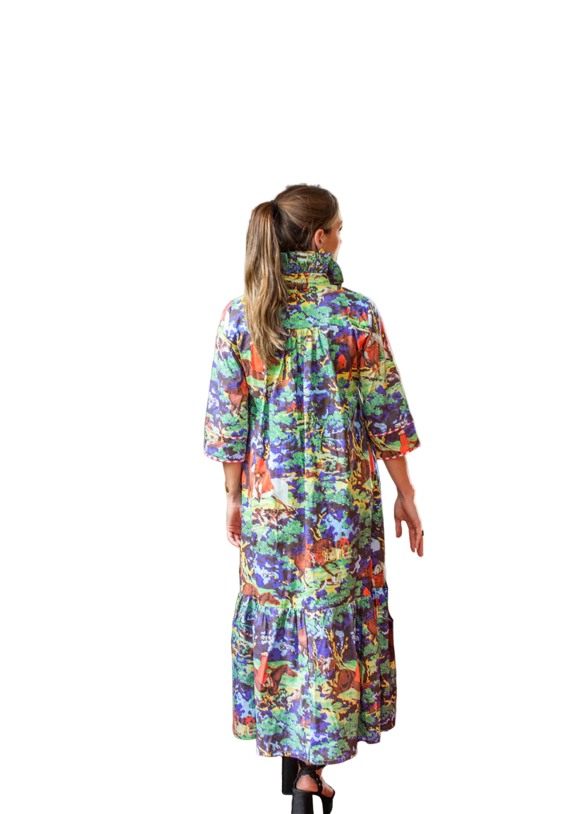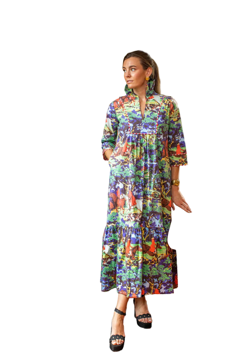 I’ve long been captivated by the stately art of the English hunt—riders in their finest, hounds in stride, all set against a lush countryside. The inspiration for this print began with a hand-painted mural panel from the early 1900s that immediately caught my eye. I knew at once—I could see it transformed into a beautiful frock!
