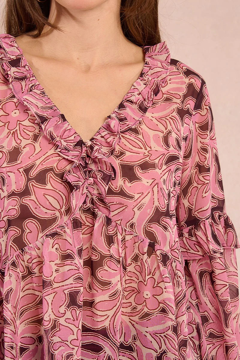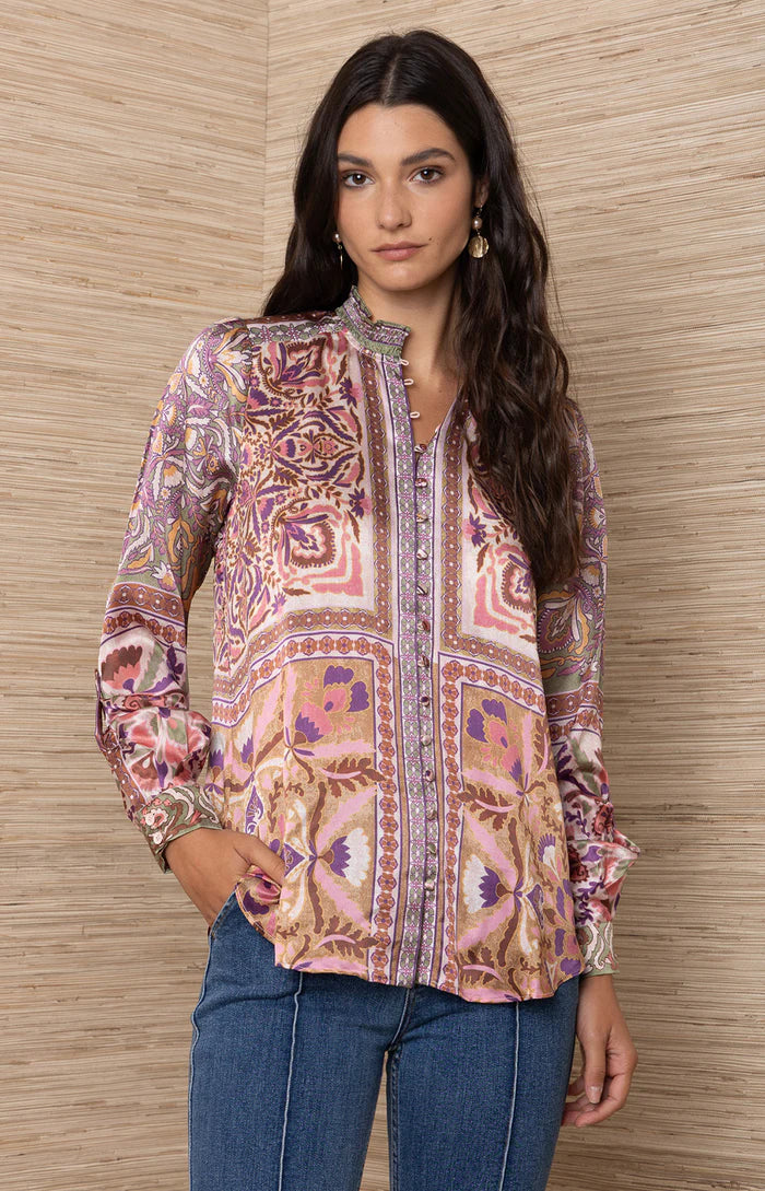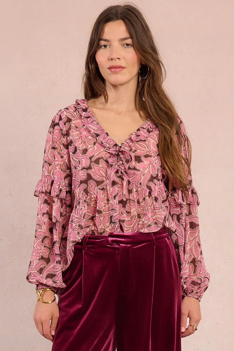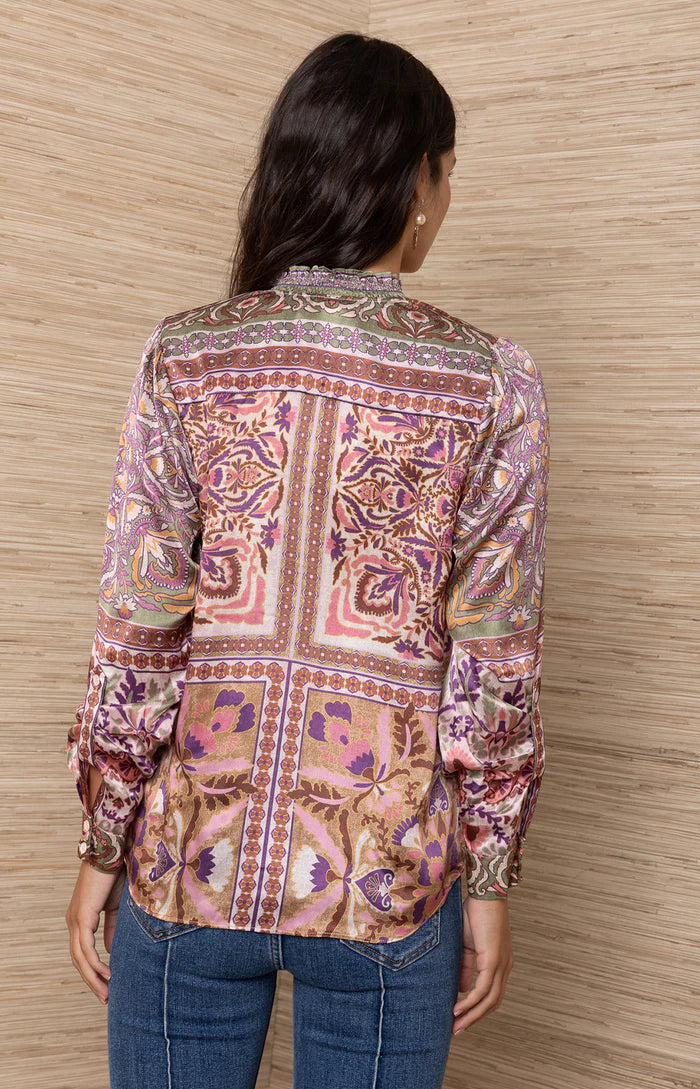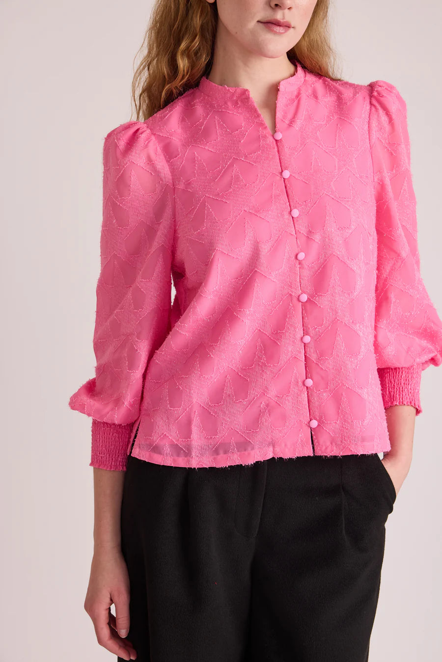 This new blouse features a ruffled stand collar, covered placket and pleated sleeves.