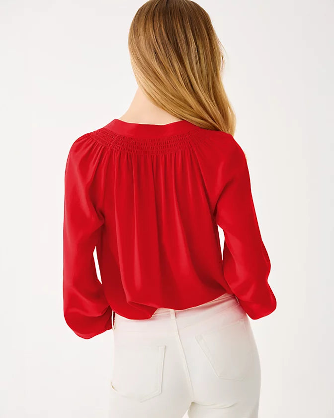 Featuring dramatically puffed sleeves, an optional tie at the neck, delicate stitch detailing, and a pretty button-front placket, our Navi top in midnight blue chambray brings an elegant touch of punk-rock femininity to the tailored Crawford mini skirt, pictured here in tonal navy denim. It’s a refined, modern take on denim-on-denim dressing.