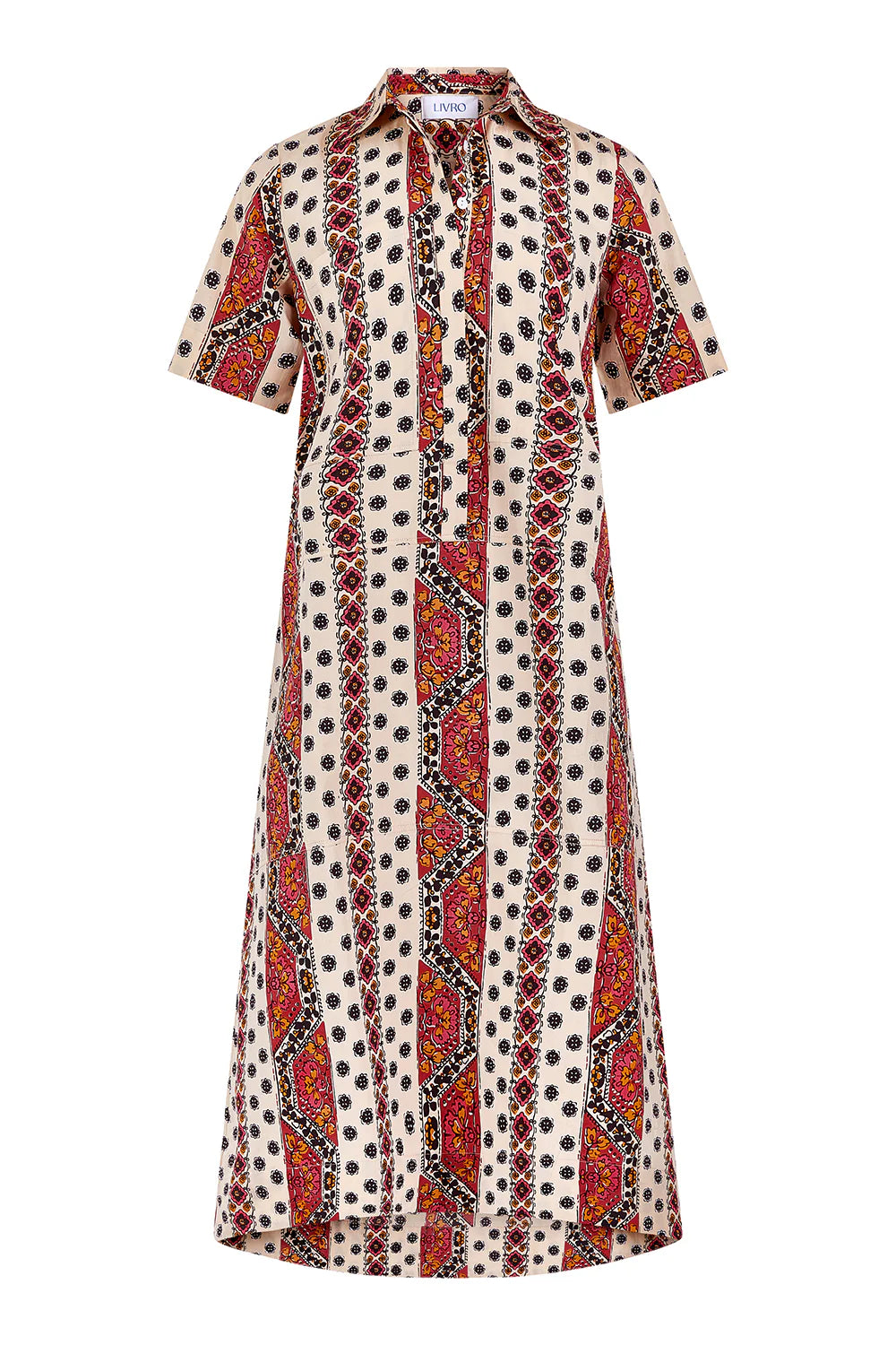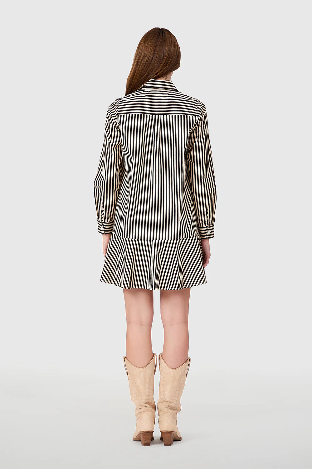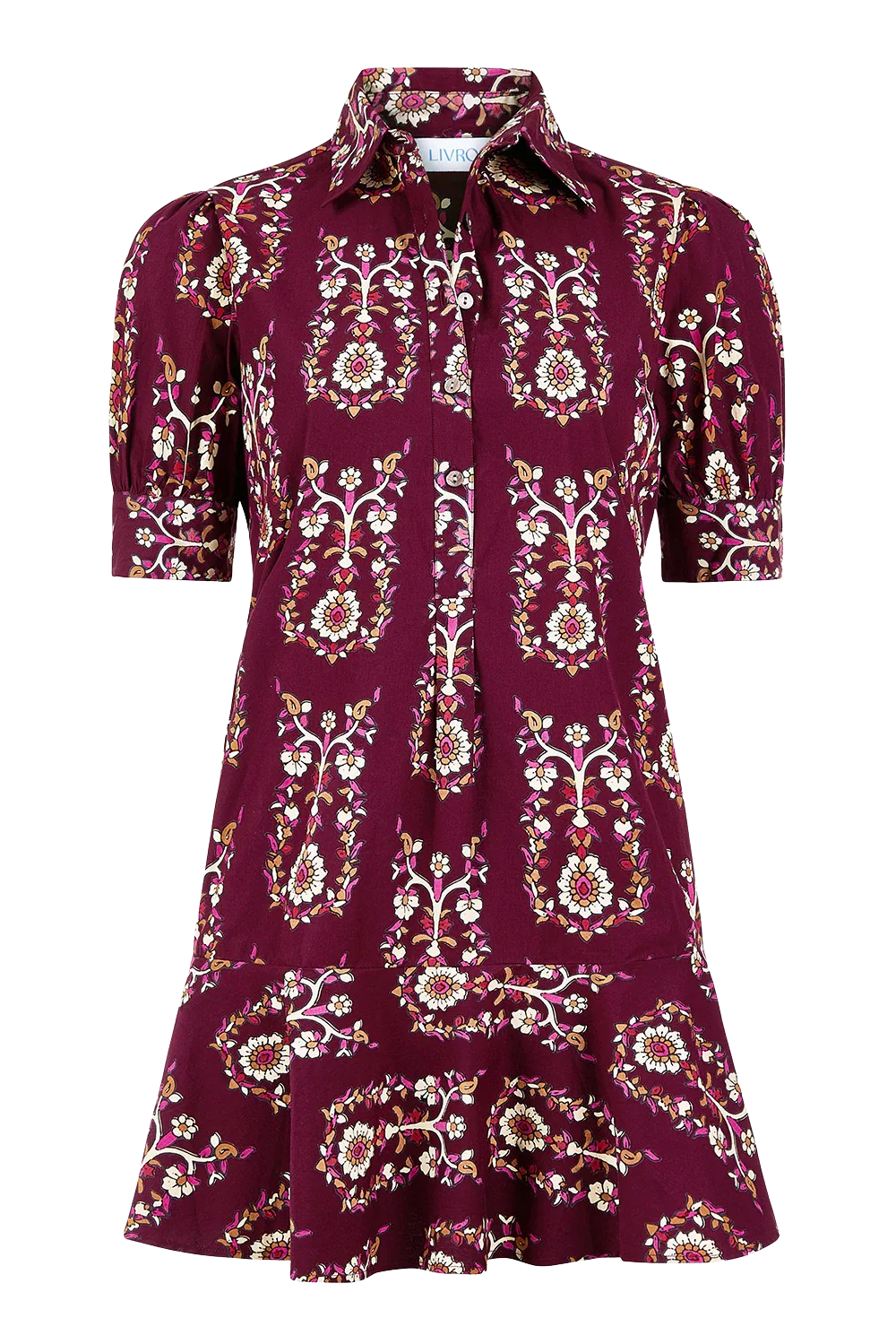 The Liv Dress is a playful mini dress with a tailored bodice and a relaxed drop-waist silhouette. It features short puff sleeves with cuff detailing, a classic shirt collar, and a partial button placket down the front. The skirt is finished with a flounced hem for a feminine, swingy shape.