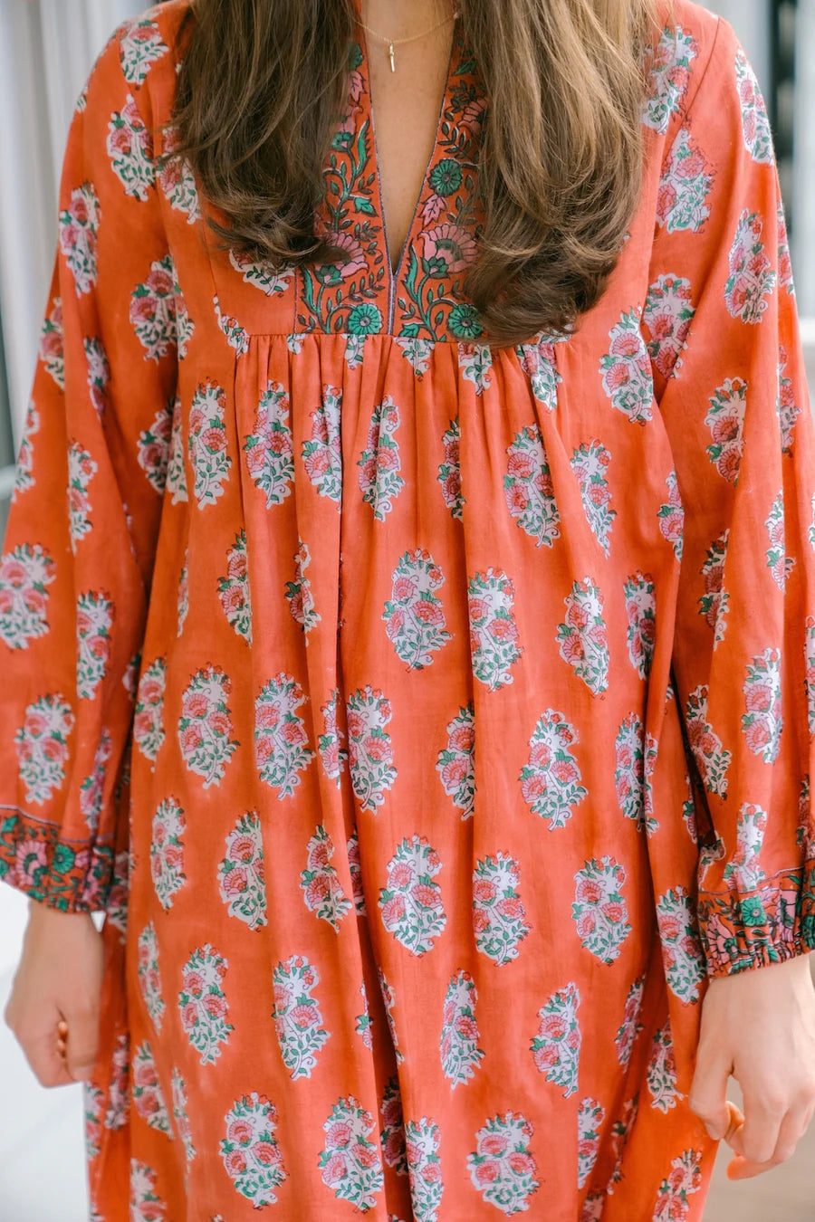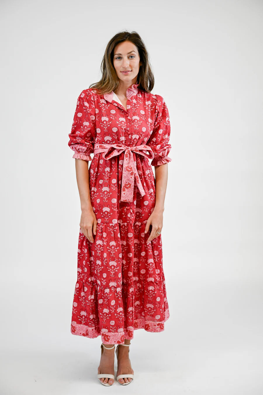 Regular price $210.00The Brooke features a ruffled collar, front button placket, gathered skirt, elbow length puff sleeves with contrasting ruffle cuffs, and side seam pockets.