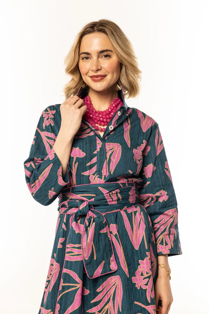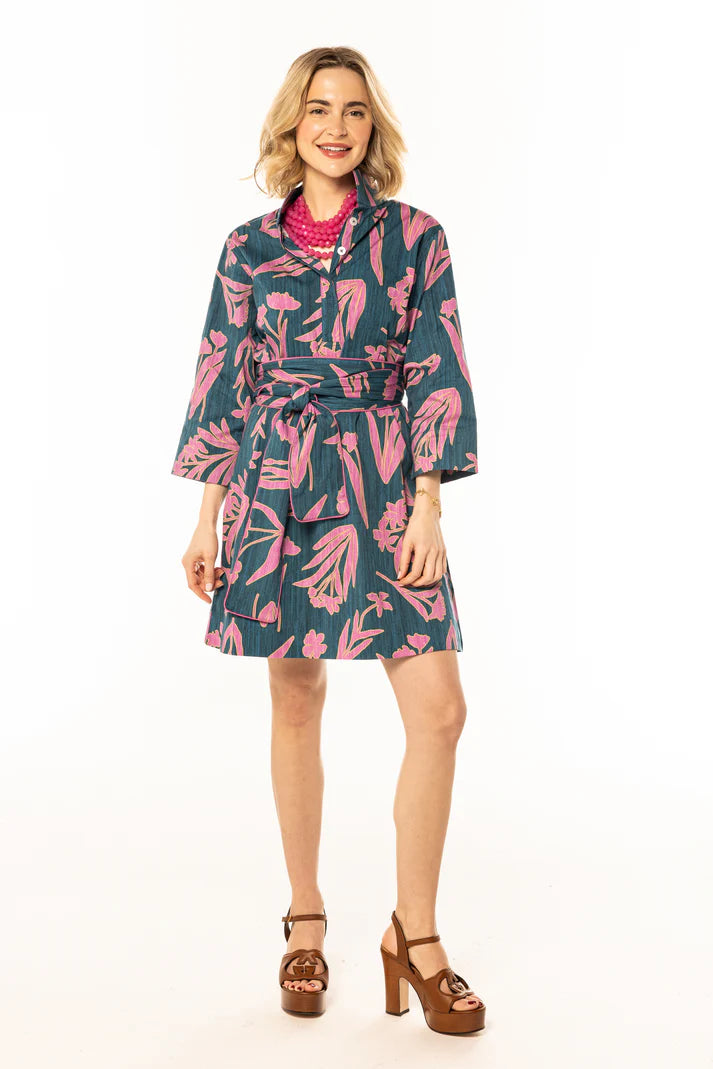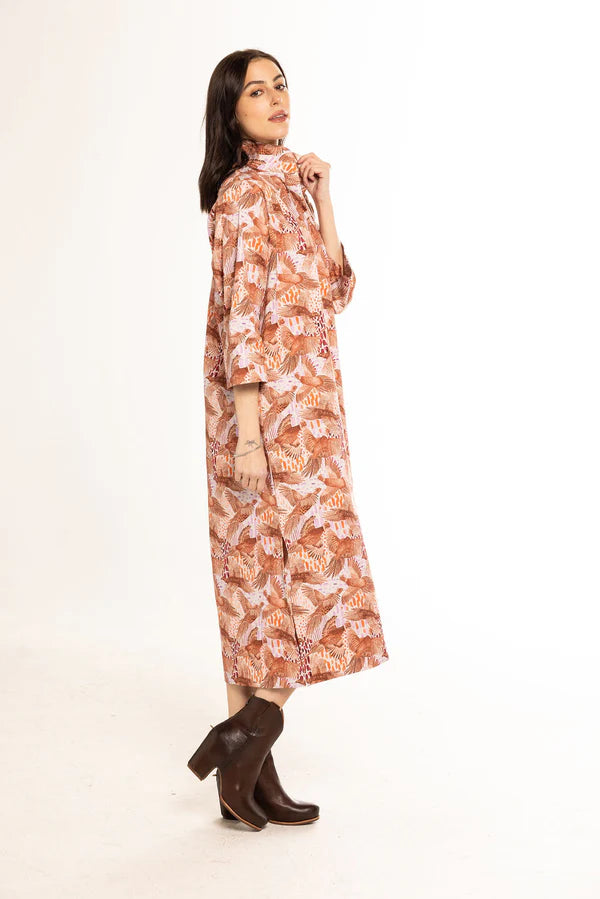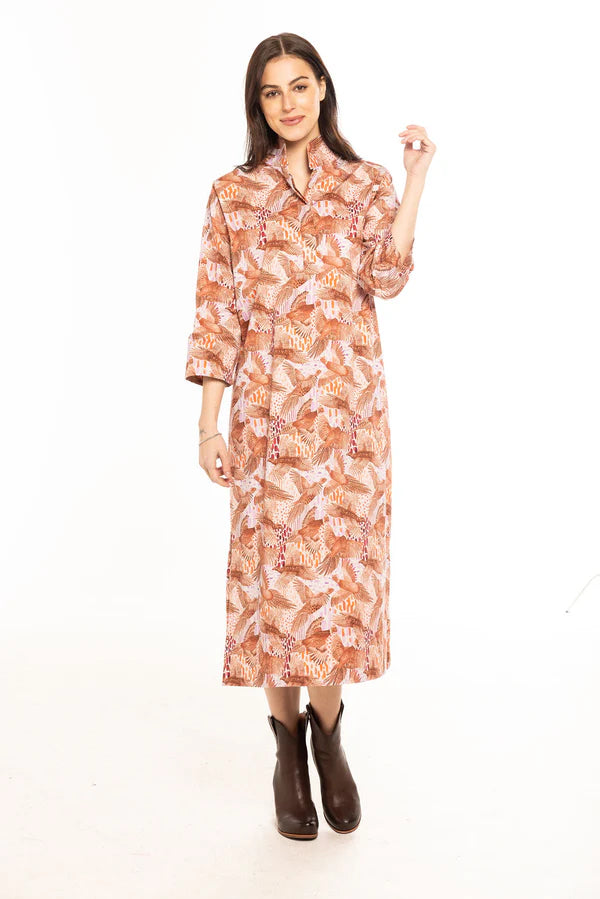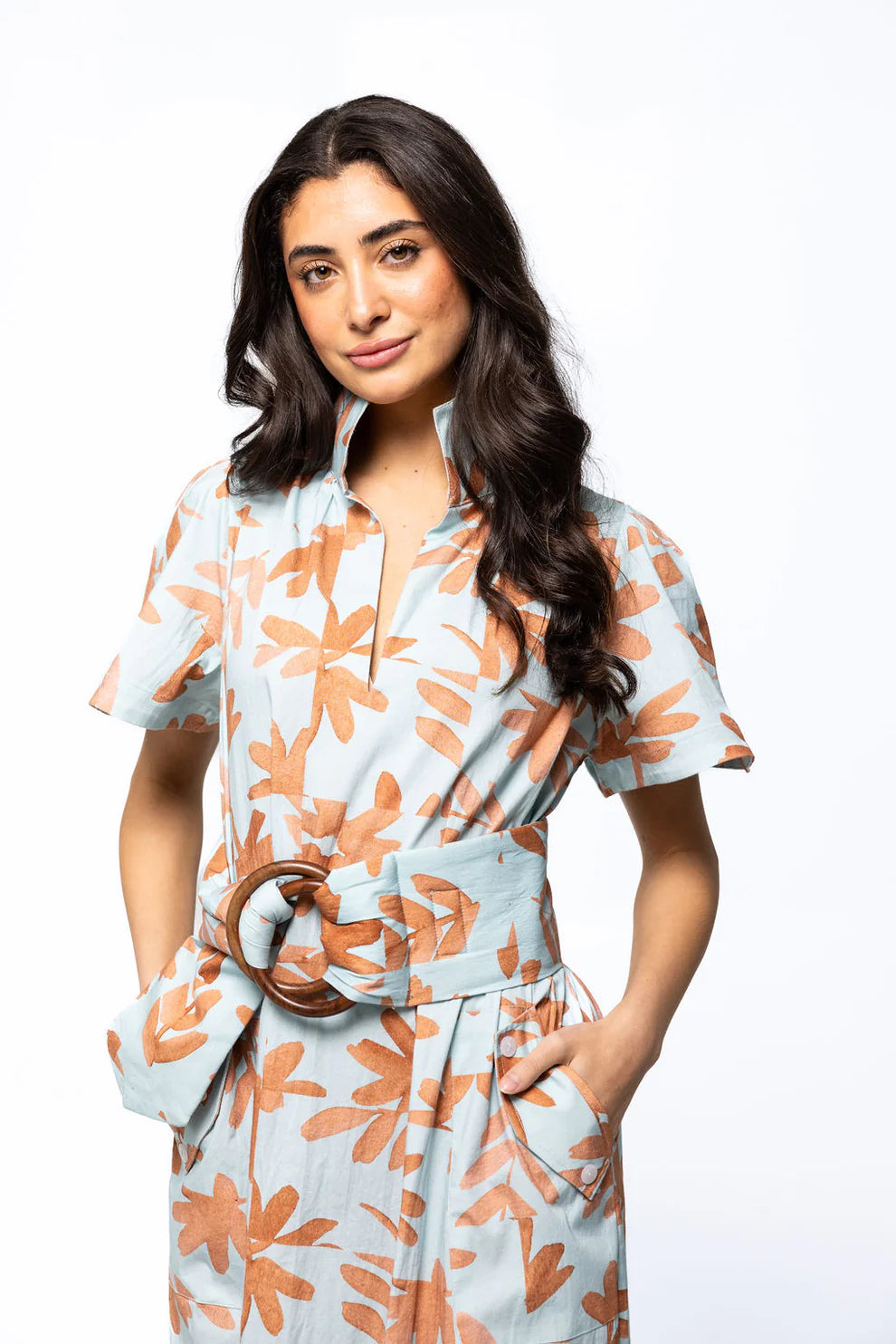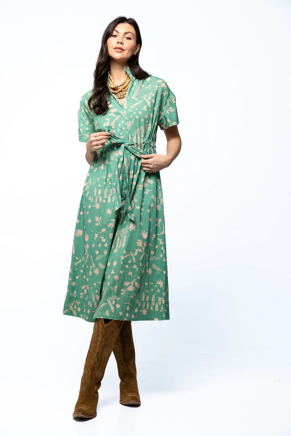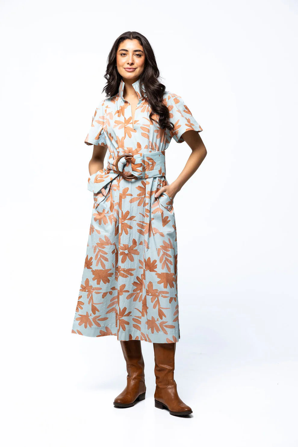 This "nod to mod" stand collar dress is the perfect "throw and go" piece! With an adjustable waist offering a tailored fit, this sundress will be an instant go to as we transition into fall. Our Fall Folk Collection with prints by Dallis Foshee will not disappoint.