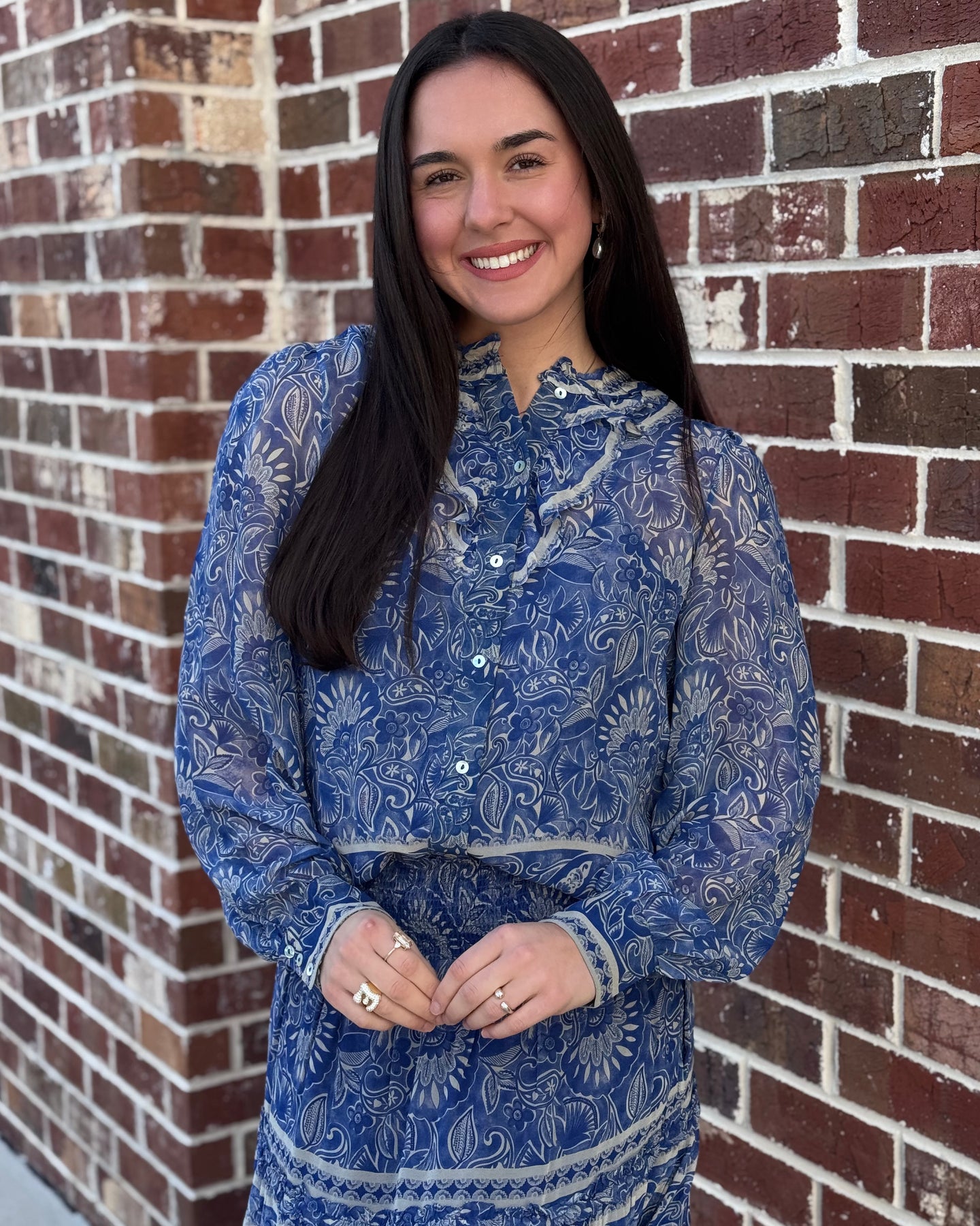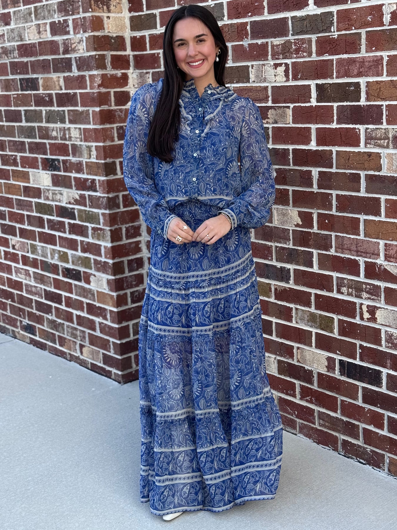 The Lindsey Long Dress is a romantic statement piece in vibrant paisley. Designed with flutter sleeves, a flattering ruched bodice, and a tiered skirt for graceful movement. The open square back adds a modern, feminine touch.