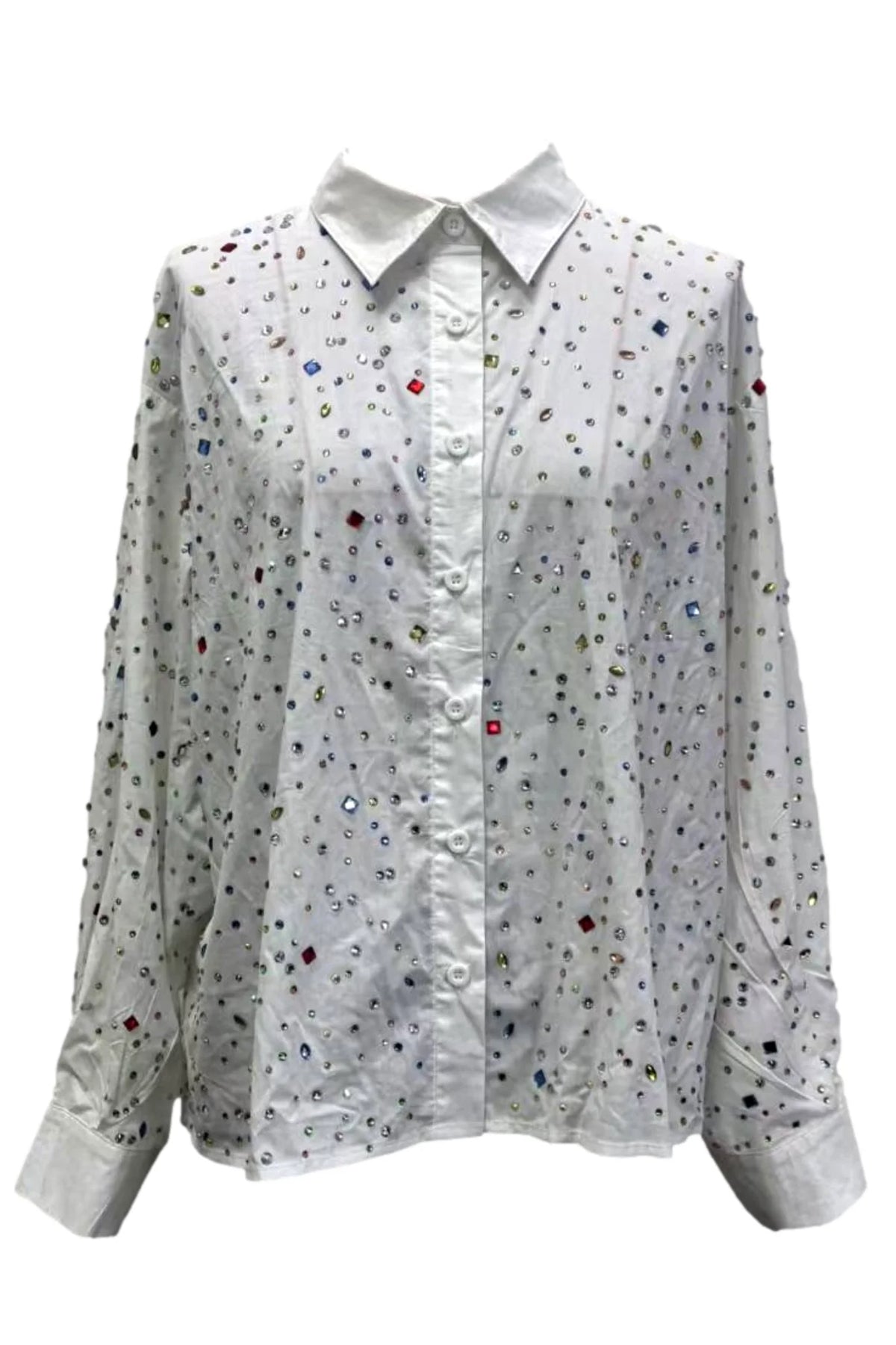 Shine bright in the Queen Of Sparkles White Rhinestone Cotton Button Up Collared Top. With a relaxed fit, classic collar, and colorful rhinestone embellishments, this top effortlessly combines comfort and glam. Pair it with jeans for a standout casual look or dress it up with a skirt or trousers for parties and special events. Perfect for anyone who loves to sparkle.