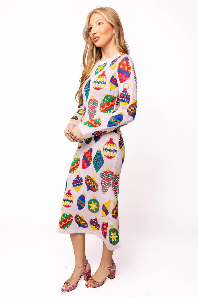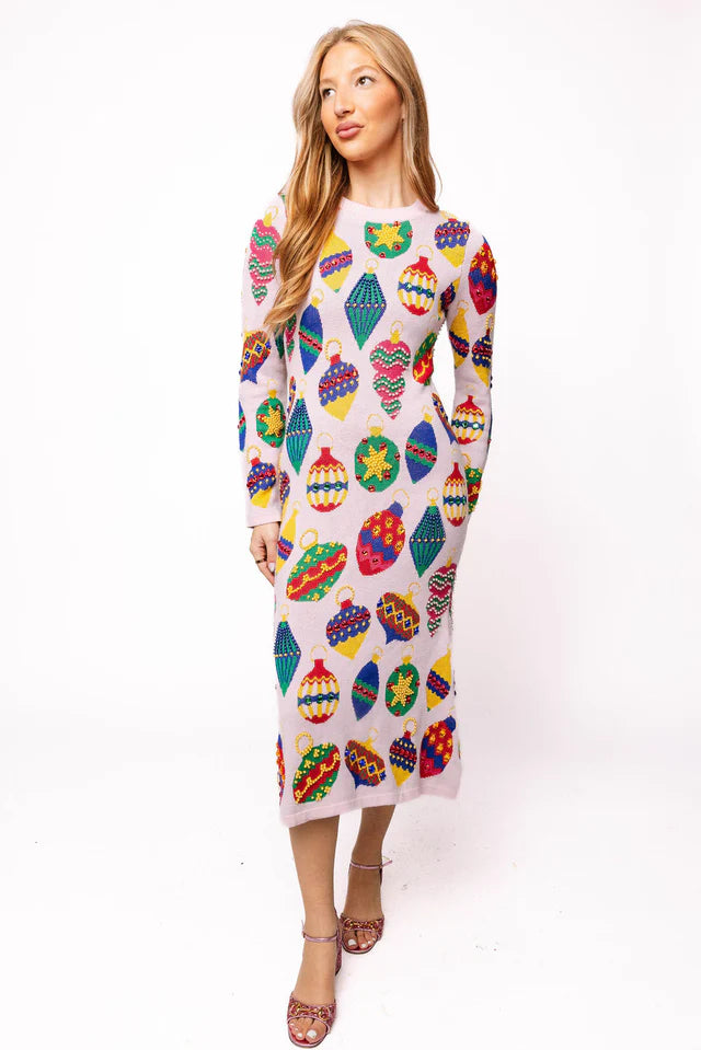 Celebrate the season in style with this Light Pink Multi Jeweled Ornament Knit Midi Dress. Cozy and warm, its festive jeweled accents add a sparkling touch perfect for holiday parties. The midi length offers comfort and charm, making it your go-to dress for merry moments and cozy gatherings.
