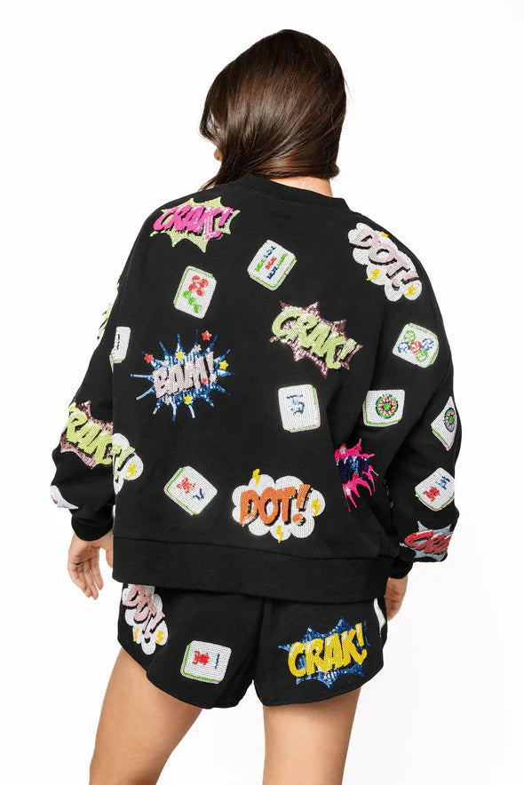 Stay comfy and stylish in the Queen Of Sparkles Black Mahjong Icon Sweatshirt. With a relaxed fit, crewneck, and long sleeves, it’s perfect for everyday wear. Colorful mahjong graphics add a whimsical, eye-catching touch to this cozy staple.