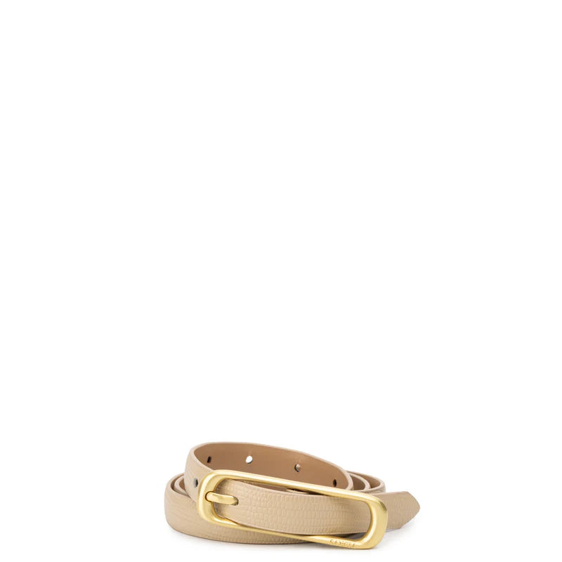 The Picarra features a sophisticated new brushed gold buckle on SANCIA’s classic vegetable tanned leather belts. The minimal rectangular buckle features sleek curved edges and is the perfect skinny belt for an understated look. Style this belt with a simple jeans and tee outfit for an elevated touch.