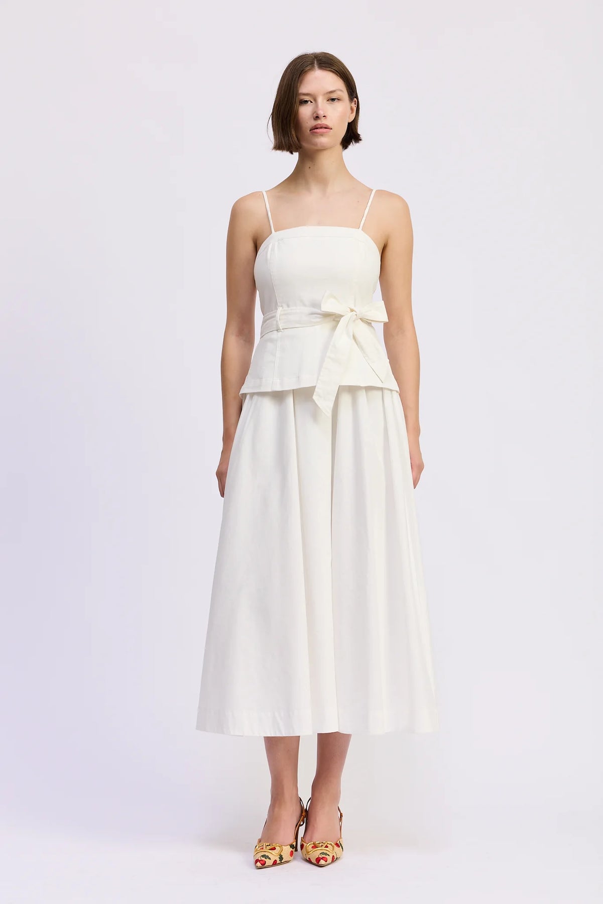 - Full-length silhouette with side slits for movement and graceful flow