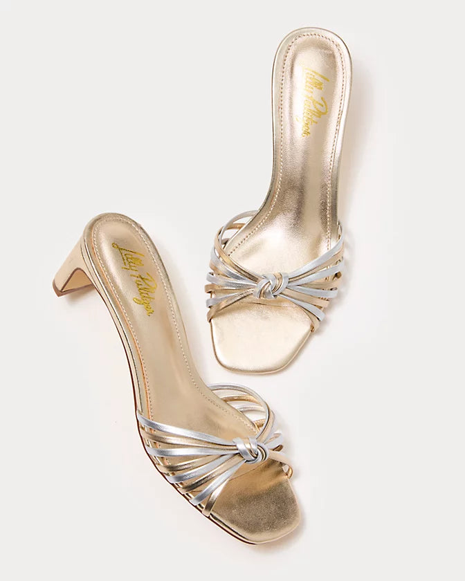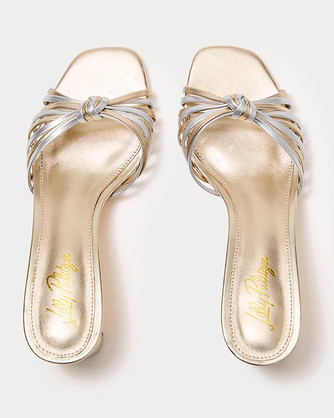 Two-toned metallic leather strappy slide sandal with a knot detail and a plush padded footbed.