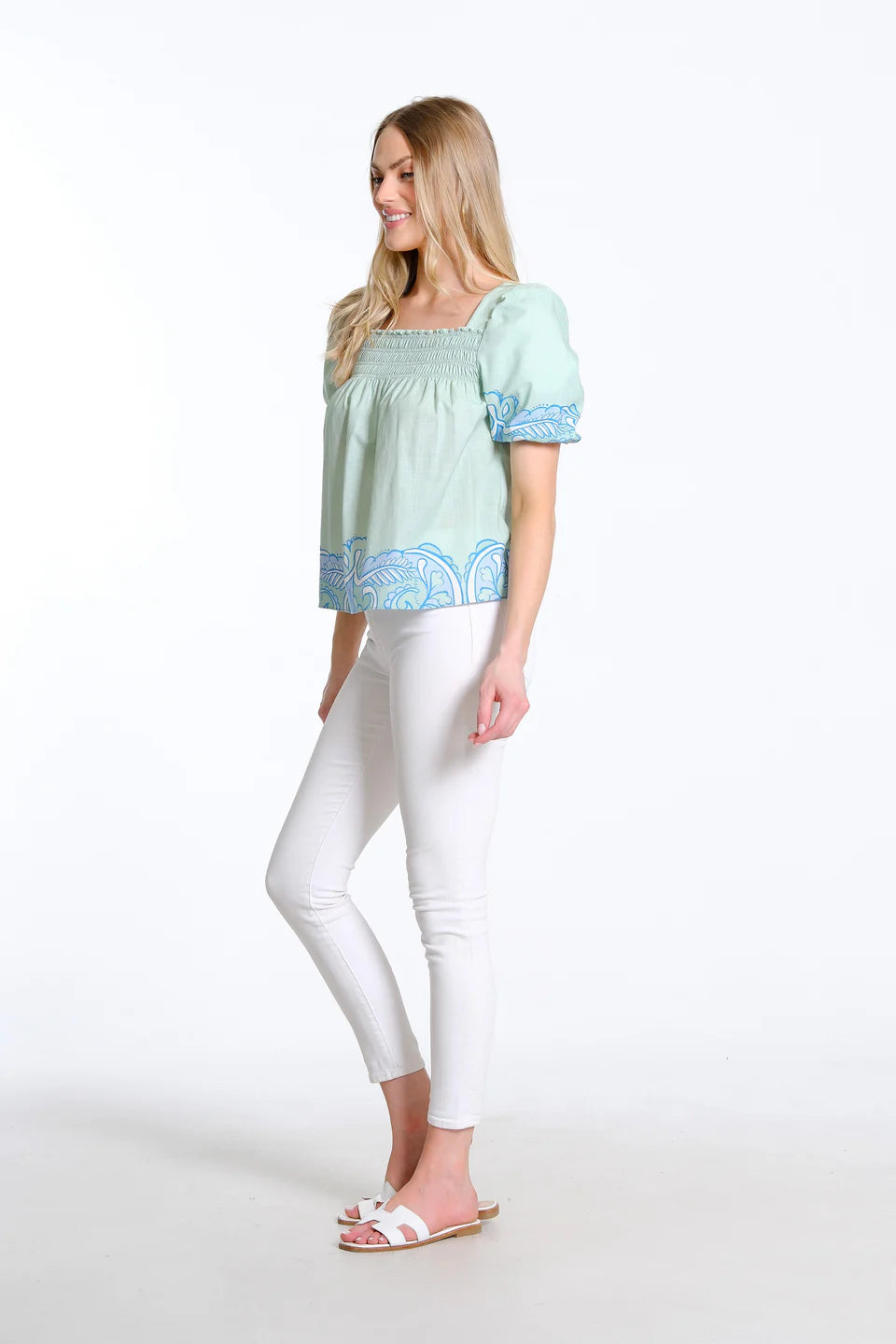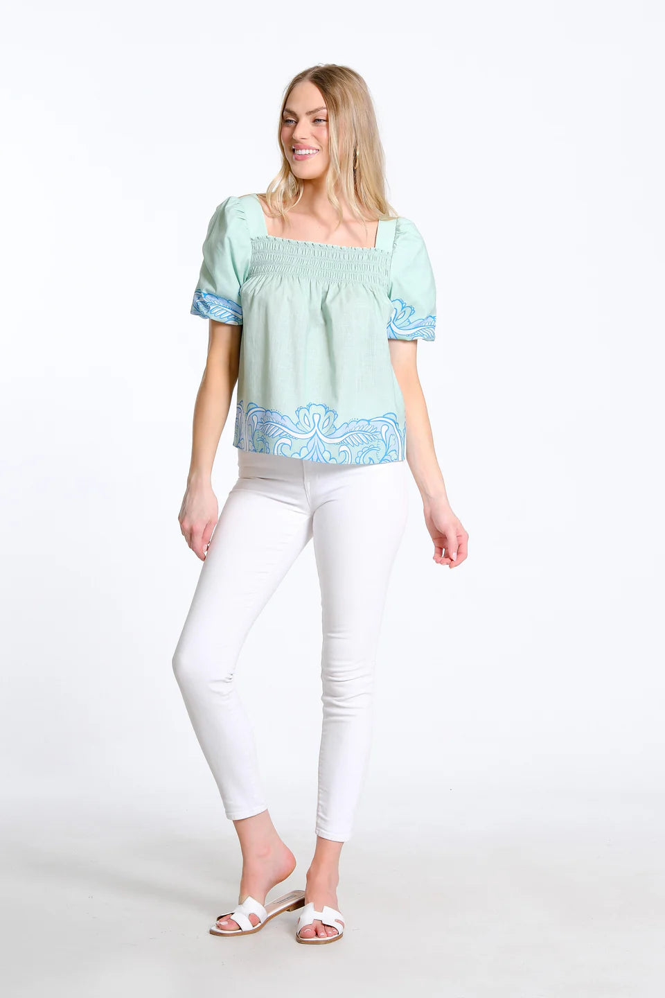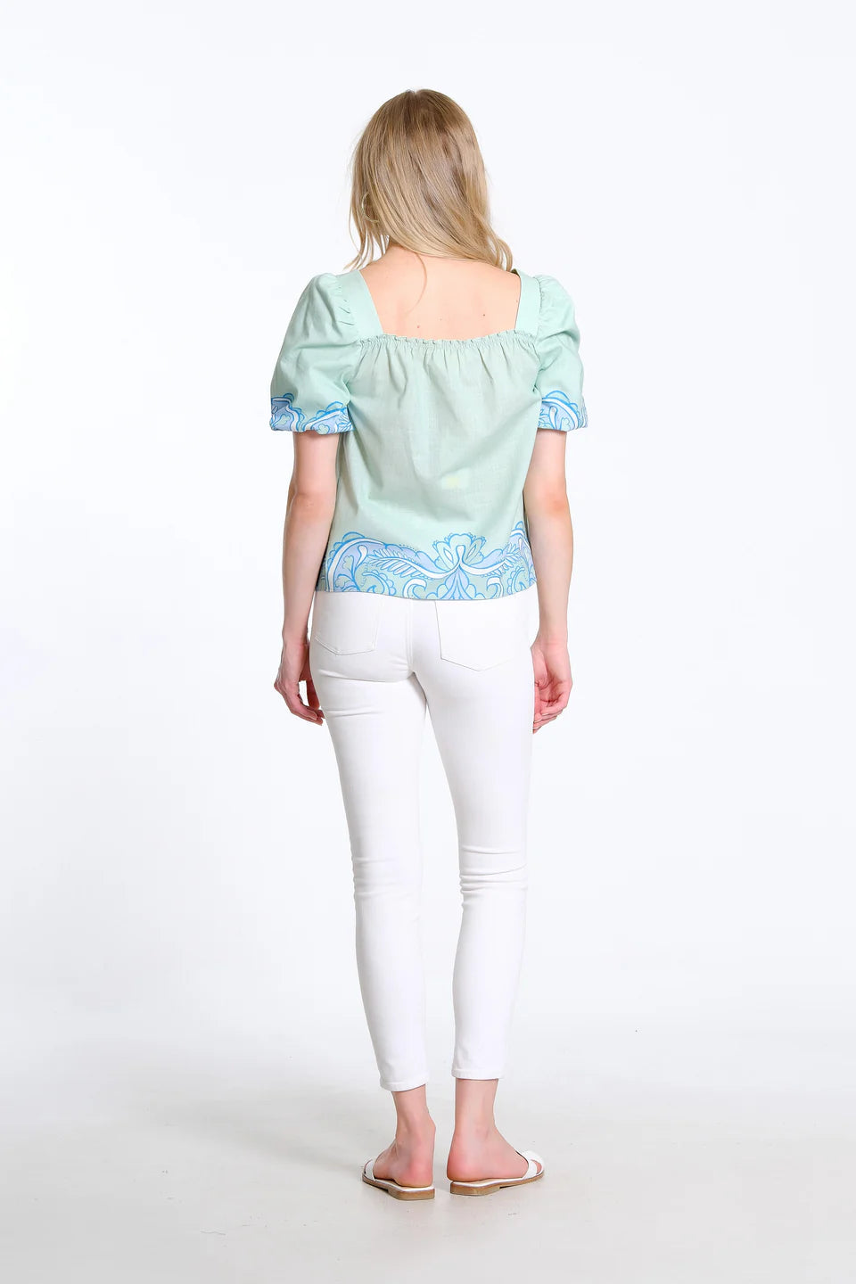 The Mona Top is Love the Label's take on a classic button-up.Offered in our classic cotton poplin in Mood Indigo,it features feminine details such as self-ruffles around the yoke and elongated sleeve cuffs,with shell buttons down the center front and at the cuff openings. Match back to the Marcy Midi Skirt for a chic resort look.