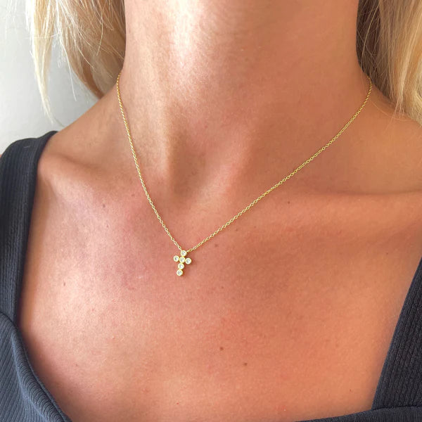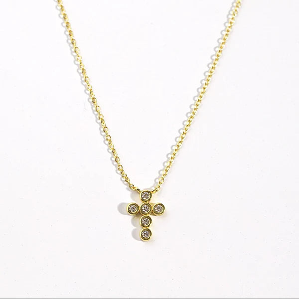This adorable 15" length with a 2" extender Baby Cross necklace is crafted from 18K gold plated sterling silver and set with brilliant diamond cubic zirconia stones. It's a piece of jewelry that will never go out of style.