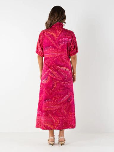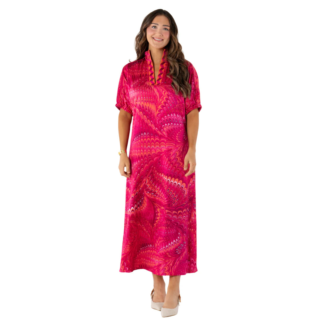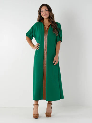 The Sadie Dress in Jellybean is an easy, elevated silhouette designed for seasonless wear. It features a mandarin-style collar, quarter-length blouson sleeves, and a tiered construction that creates a loose, relaxed fit. Finished with covered button closures for a soft, tonal look, this style balances comfort and polish, making it an effortless everyday essential with a vibrant pop.