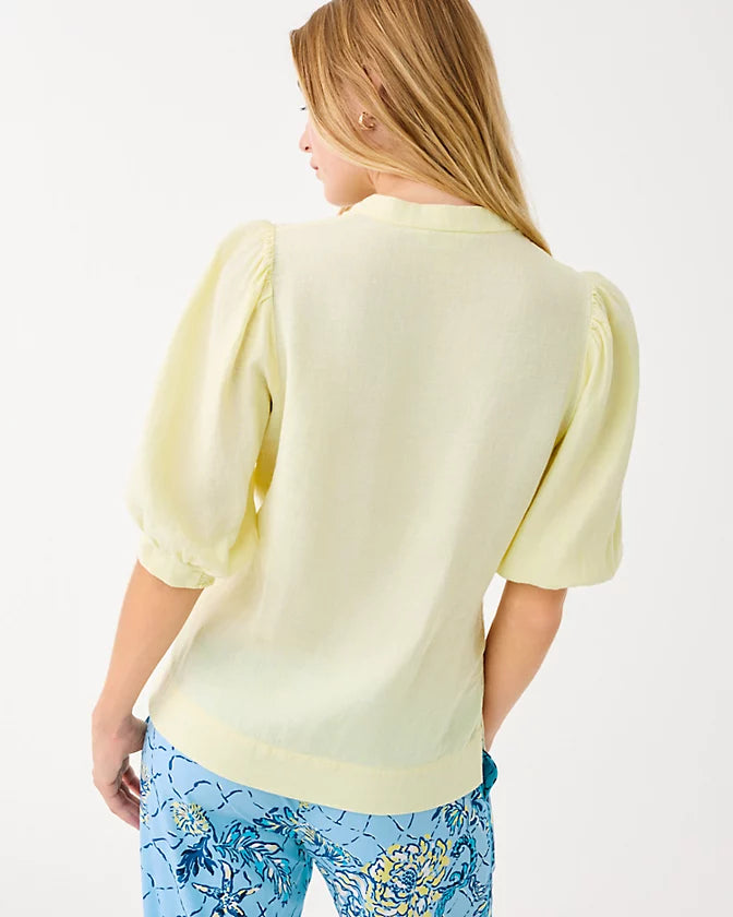 Easy fit, pullover blouse with gold buttons and bracelet-length sleeves.